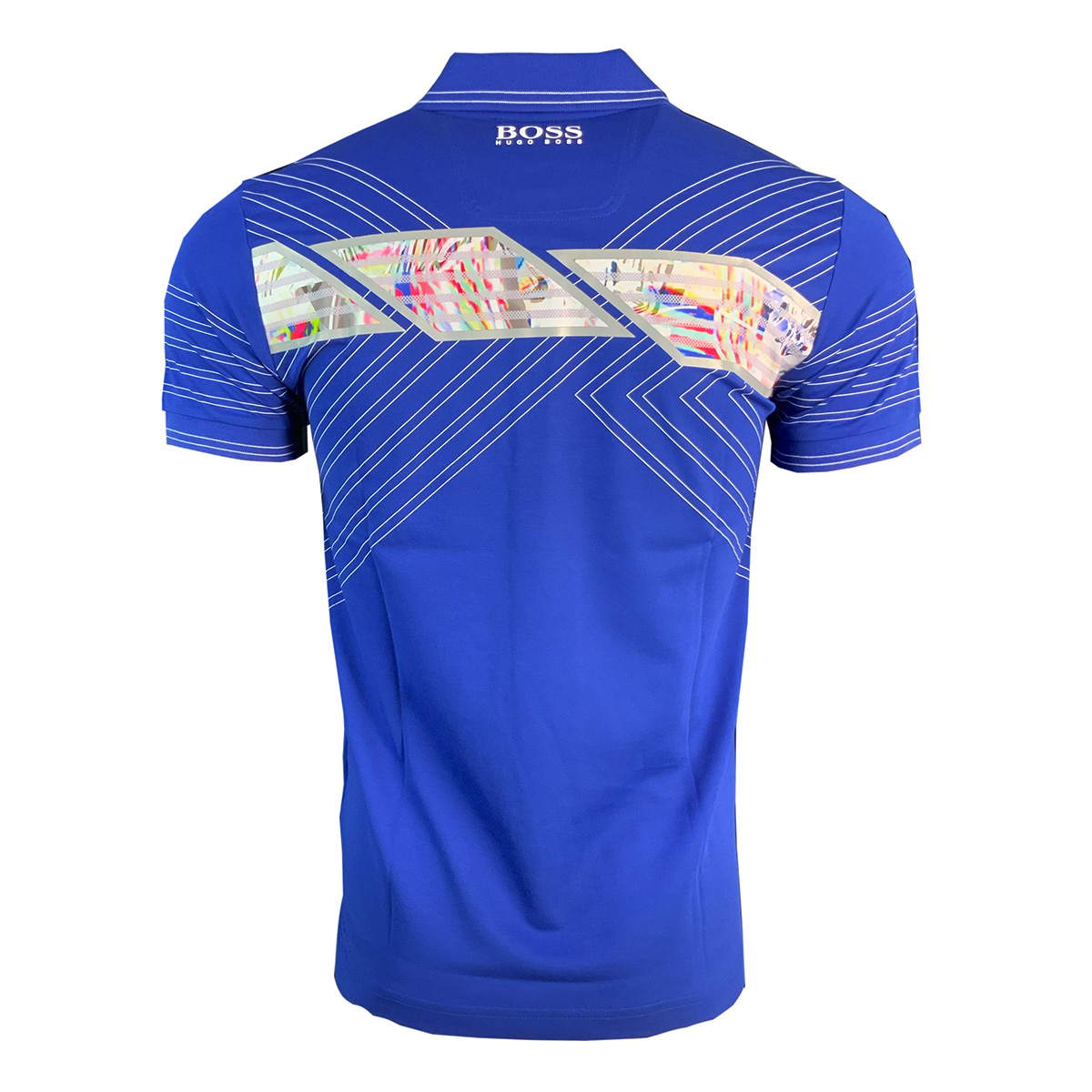 A polo shirt by BOSS Menswear, constructed in cotton-rich fabric with natural stretch for flexibility. Cut to a defined silhouette with short sleeves, this sporty piece is designed to wick moisture away from the skin for a fresh feel. Stripes at the shoulders and sleeves combine with chevrons and a graphic print at the back to give this polo shirt a dynamic look. Part of the Premium Golf collection from BOSS